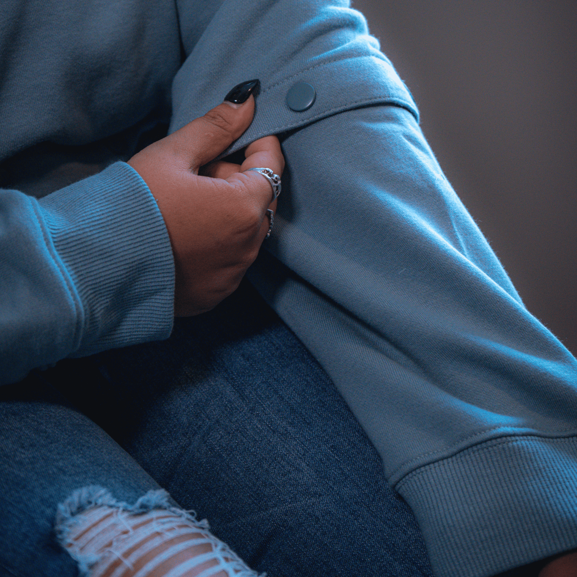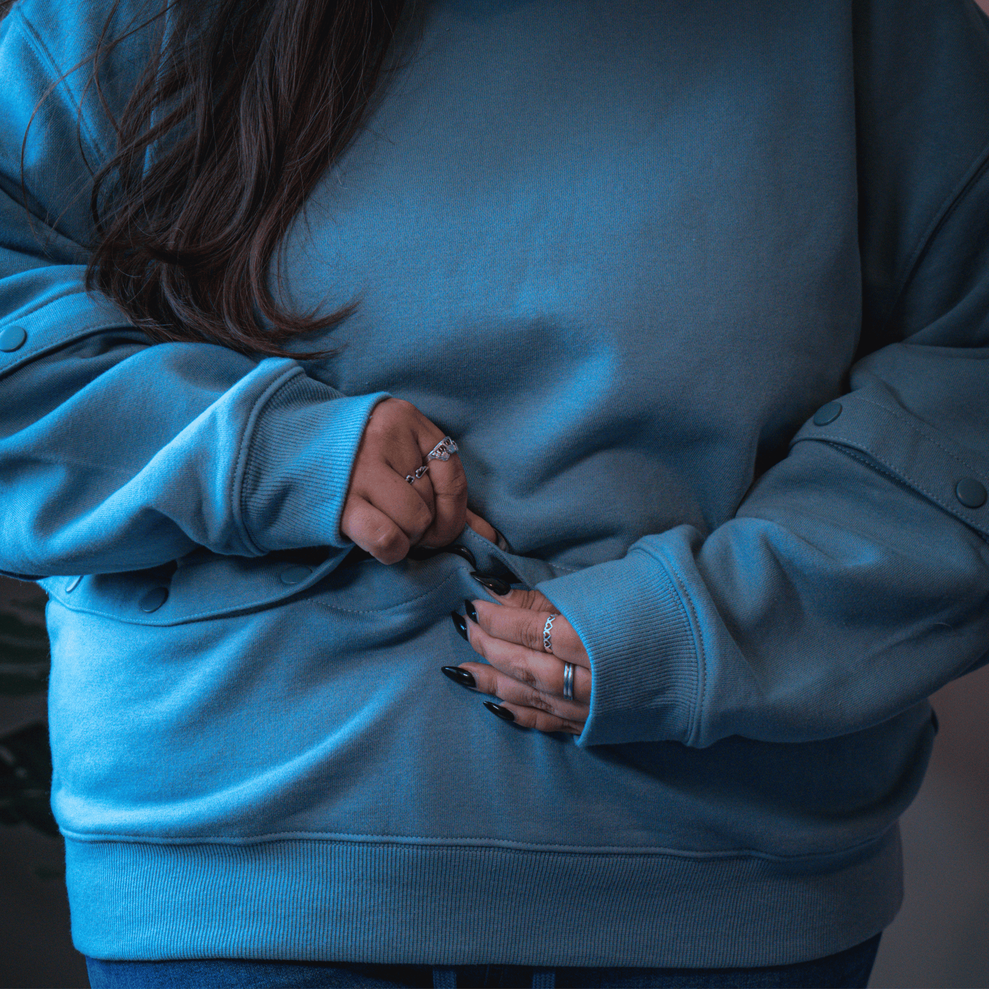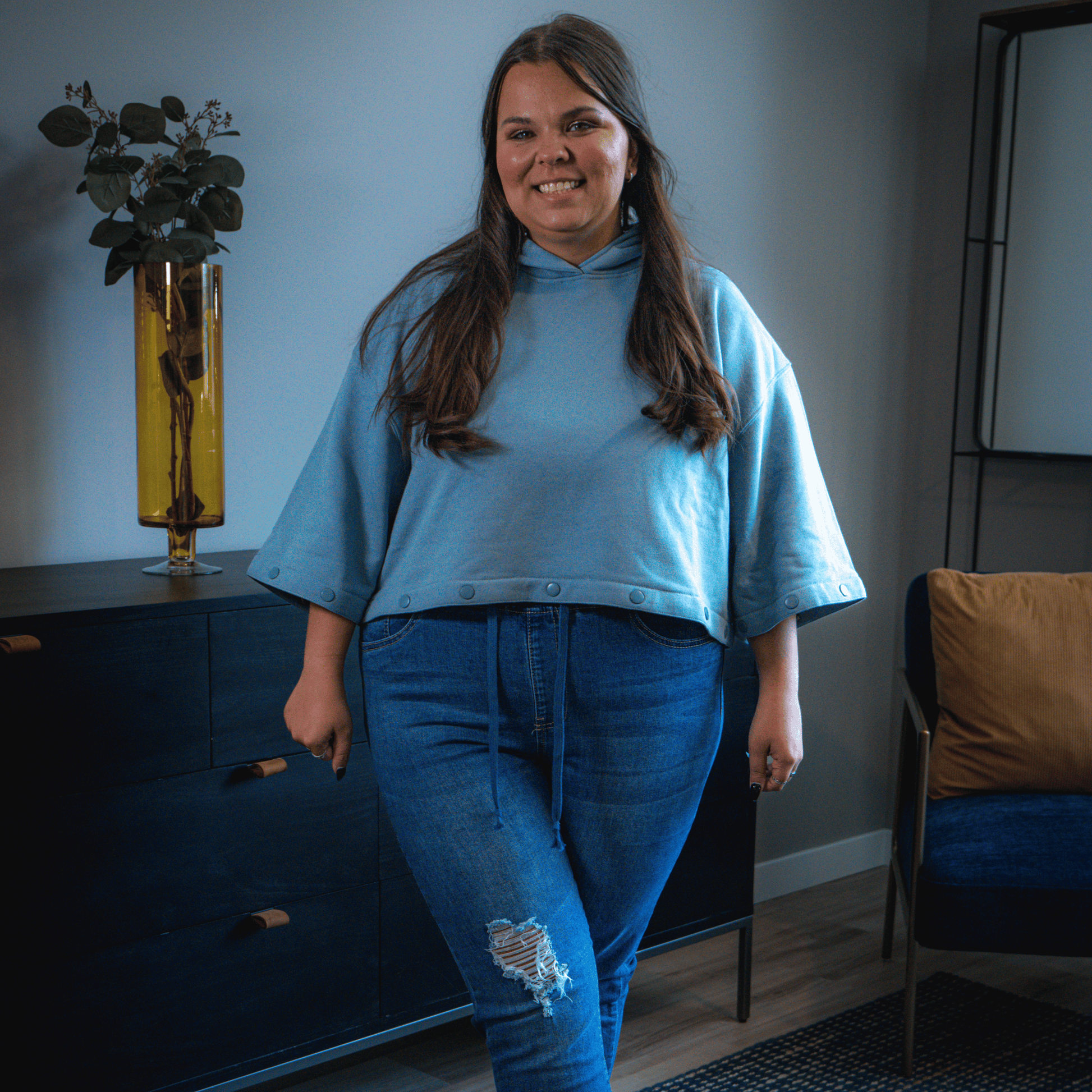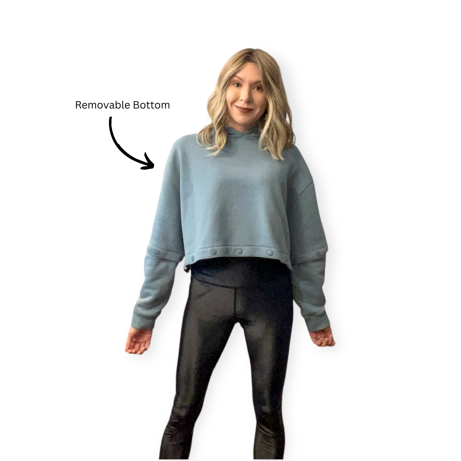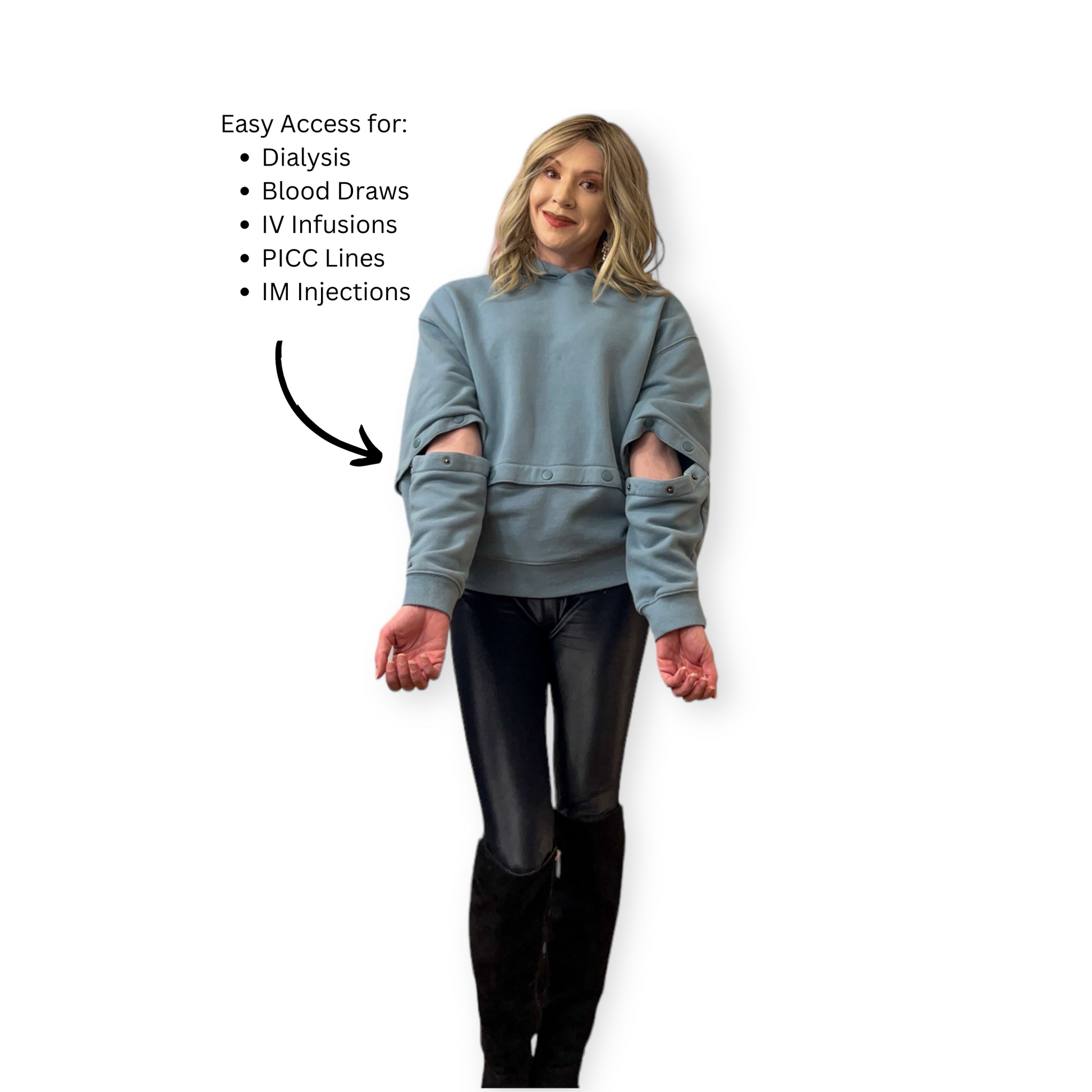 The Blue Earth River 4-in-1 Hoodie is truly an adaptable apparel dream! Do you have a SHUNT or PICC Line? Receive regular IV Infusions? Recent shoulder operations? Now, you can wear one garment that can serve 4 purposes: Longline Hoodie Sweatshirt, Cropped Hoodie Sweatshirt, Longline Half Sleeve Hoodie (for access to your PICC Line, SHUNT, and IV), Pullover Cropped Half Sleeve Hoodie (for access to your PICC Line, SHUNT, and IV).
