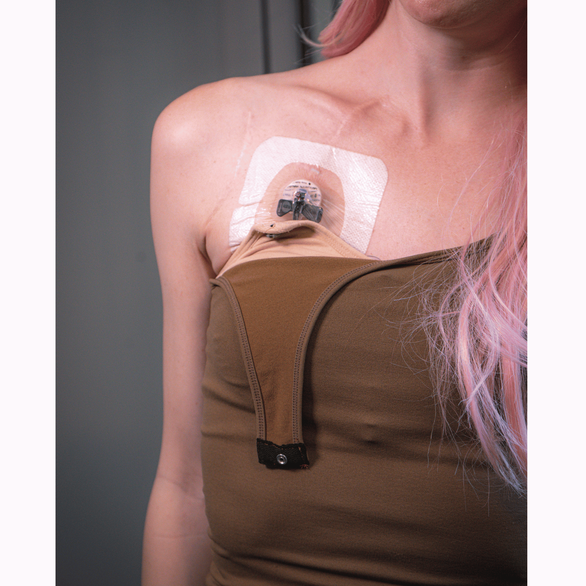 We have added a snap on each shoulder for port access/deaccess, for individuals dealing with limited mobility or healing from an upper-body operation. The stretchy material will enable you to unsnap and slide over your head or pull from the bottom up. The light fabric fits comfortably over a port or incision.