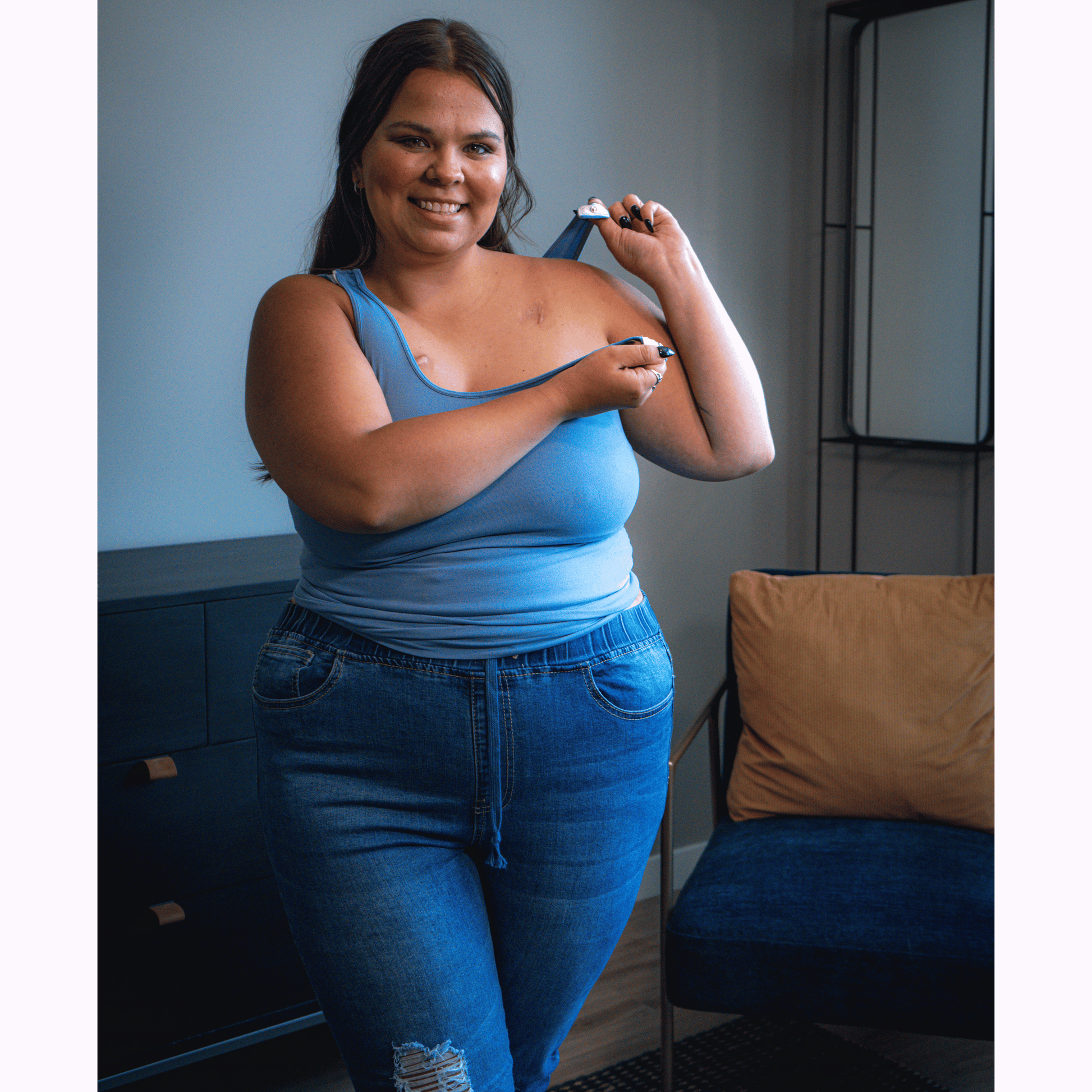 The Chesapeake "Port" is designed for Limited Mobility, Recent Operation, and Port Access/Deaccess. You can wear this comfortable tank every day! This seamless tank is one size fits most the product fits Small, Medium, and Large individuals.