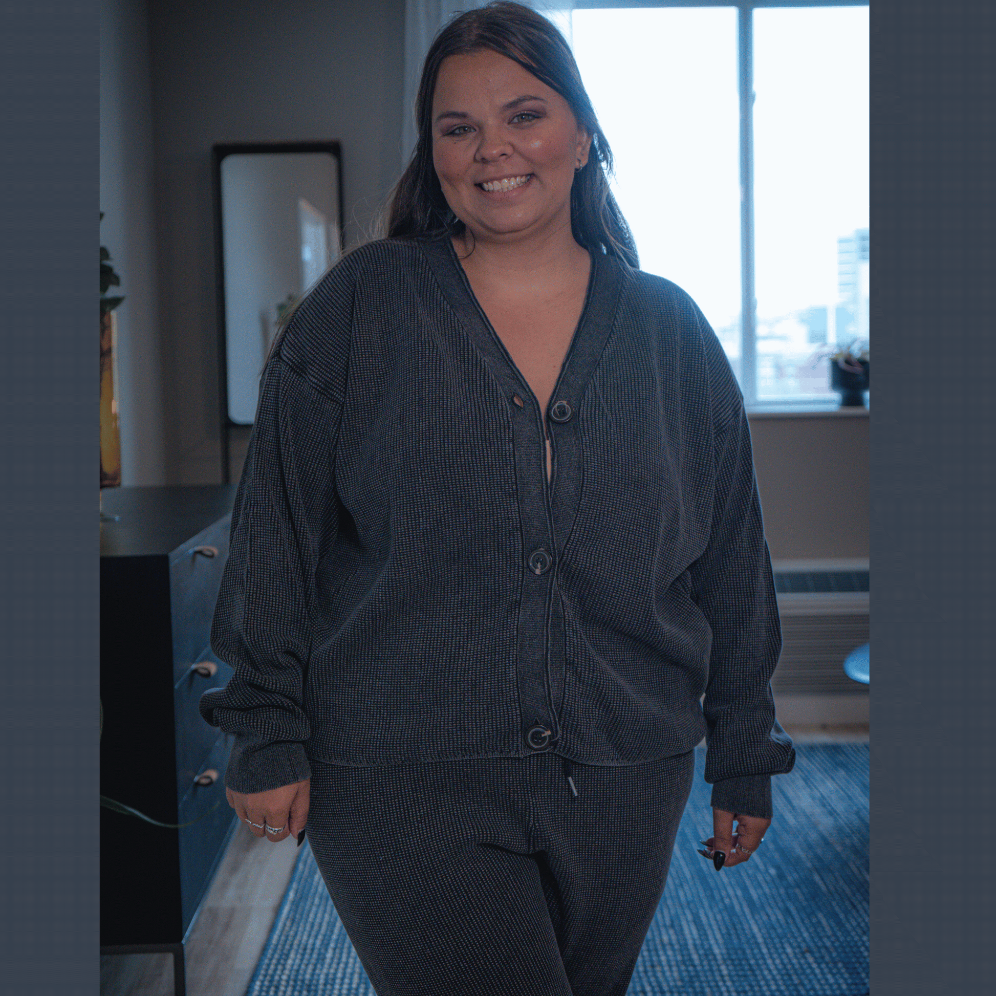 Stay warm and cozy in style with this Knit Cardi Set. This two-piece black acid wash set includes a relaxed-fit cardigan and comfortable pant for the perfect combo to chill in. Let your look stand out with a unique and bold acid wash - no one else will have it! (Plus it's so soft!)