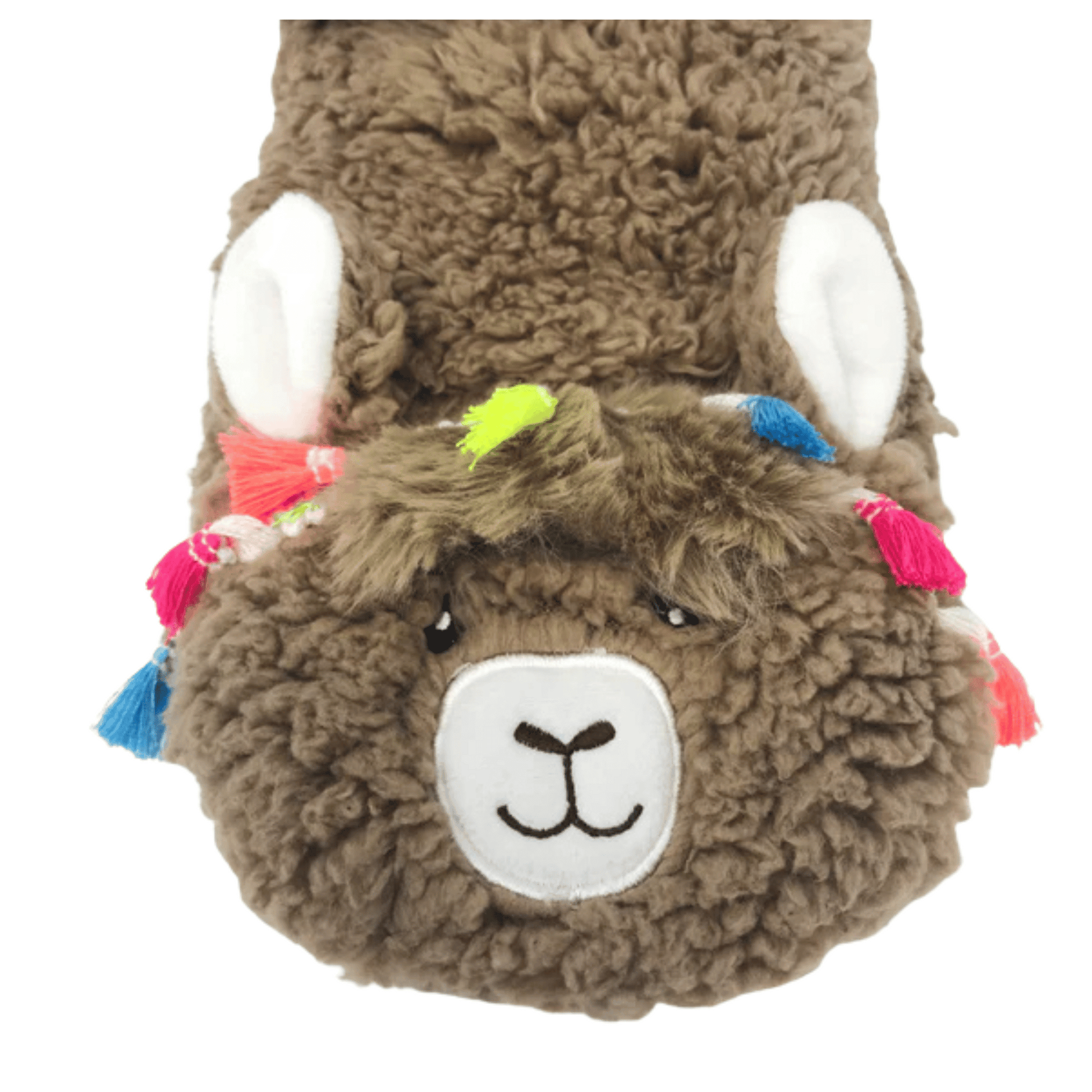 Stay warm & look great with your new llama themed tan animal slipper socks. Wear them around the house or out and about thanks to the non-skid rubber bottom.